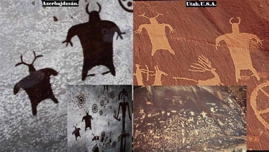 Слева - Гобустанский государственный историко-художественный археологический заповедник в Азербайджане, к югу от Баку. Рисунки 4-2 тысячелетия до н.э. Справа - Индейский Национальный парк (округ Сан-Хуан, Юта, Соединенные Штаты). Примерно 1000 лет до н.э. Почему этих рогатых персонажей изображали вместе - непонятно. Для тех тысячелетий любые туристические круизы через океан исключены.