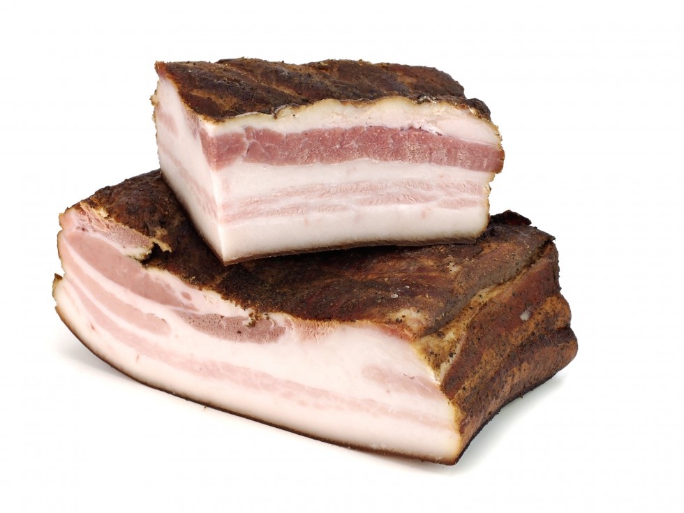 Всем привет. Сегодня мы готовим сало. Вас ждет три рецепта. Первым будет сырокопченый бекон. Для него возьмем 120 грамм нитритной соли, 20 грамм обычной соли и 50 грамм сахара. Теперь все добавляем в 1 литр воды и перемешиваем. Берем килограмм сала и шприцуем соляным раствором. Оставшимся раствором заливаем и оставляем на несколько дней. Просушив сало полотенцем, коптим его 2 часа. После того как сало закоптилось, уплотняем пищевой пленкой и даем время остыть. Бекон получился очень нежным и мягким, в меру с солью и с тонким ароматом дымка. Второй рецепт. На оливковом масле обжариваем до золотистой корочки 12 зубчиков чеснока. Добавляем столовую ложку душистого перца. Этой кашицей натираем сало и складываем в банки. В завершение заливаем все соевым соусом. И отставляем на сутки. Получился очень удачный рецепт. Берите на заметку. Третий, самый необычный для нас рецепт. Сладкое сало по-китайски. На сковороде карамелизуем 50 грамм сахара. И добавляем немного воды. Когда карамель стала о