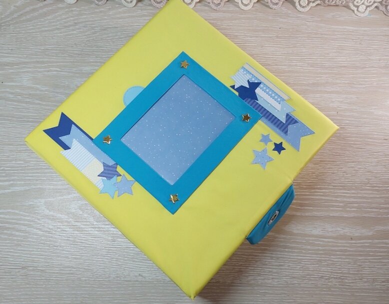 Коробка и альбом обтянуты мягкой плащевкой желтого и голубого цвета.