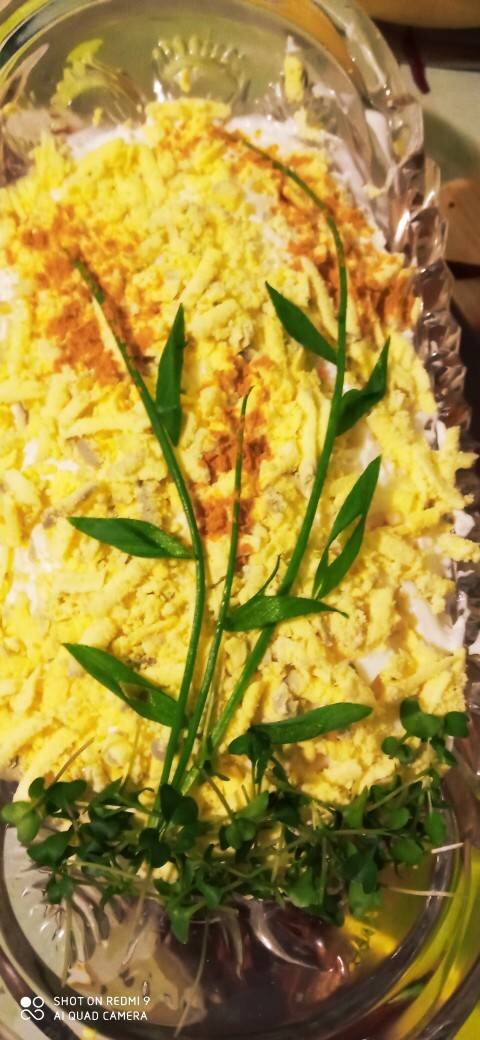 Мимоза всем известный салат, НО у меня он с жареными белыми грибами. Это вкусно!!! Попробуйте, удивите гостей, семью. Ингредиенты: Грибы белые, из заморозки, Лук зеленый , лук репка, Картофель вареный, Морковь вареная, Яйца вареные, Майонез, Масло растительное для жарки грибов, Соль, перец Способ приготовления: Грибы замороженные залить холодной водой на 10 минут. Отжать и обжарить до готовности с луком, соль, перец по вкусу. Выложить в салатник, посыпать зеленым луком. Картофель очистить, натереть на терке. Сверху на грибы. Промазать майонезом. Морковь натереть и выложить на картофель. Майонез. Яйца очистить, отделить желтки от белков. Белки потереть на терке, сверху на морковь. Майонез. Желтки потереть на мелкой терке. Из зеленого лука сделать стебли мимозы и листья. Куркумой сделать цветок. Полянку сделать из микрозелени. Приятного аппетита.