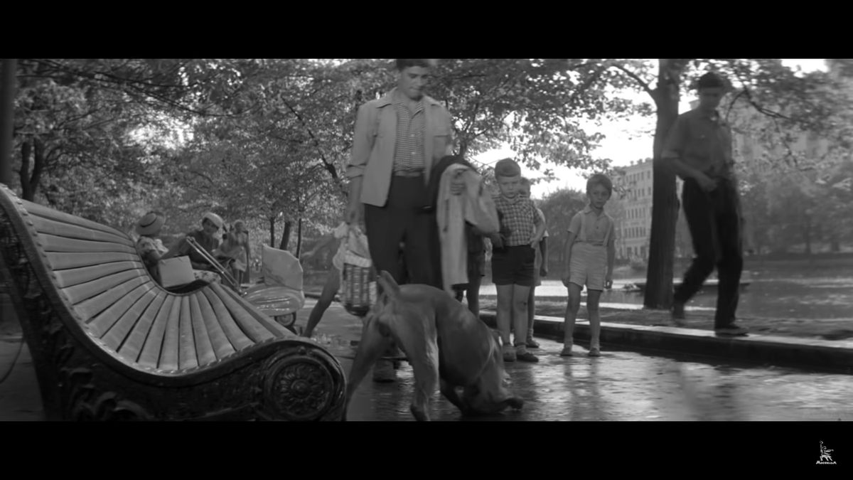 Вот сцена из "Я шагаю по Москве" (1963). Володя Ермаков (персонаж Алексея Локтева) отбирает у боксёра мяч, чтобы вернуть детям, сцена разворачивается на Чистых Прудах, в самом центре Москвы. Собака осталась без присмотра, потому что выгуливавшая её женщина зашла в церковь. Когда женщина забирает собаку, она объясняет: "Не моя собака-то — хозяйская", а чуть раньше рассказывает, что у собаки есть медали.