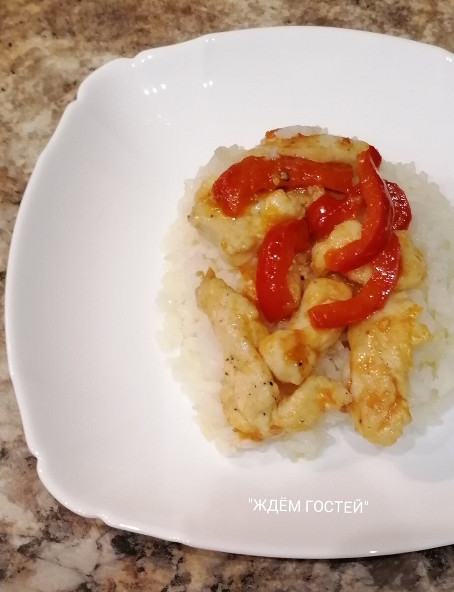 Сегодня будем готовить вкусное жареное куриное филе с болгарским перцем. Оно получается нежным, сочным и очень вкусным. Куриное филе очень быстро готовится, поэтому приготовление не займёт много времени. На гарнир хорошо подойдёт отварной рис. Это блюдо хорошо будет смотреться на праздничном столе. Ингредиенты: 1. Куриное филе 1 штука 2. Болгарский перец 0.5 штуки 3. Кукурузный крахмал 1 ч. ложка 4. Сок лимона 1 ч. ложка 5. Оливковое масло 1 ст. ложка 6. Растительное масло 4 ст. ложки 7. Соль по вкусу 8. Перец чёрный молотый по вкусу 9. Помидор 1 штука 10. Рис для гарнира 100 грамм Приготовление: Если куриное филе замороженое, то его необходимо заранее разморозить в холодильнике. Нарезать филе небольшими брусочками. Филе посолить, поперчить и полить лимонным соком. Добавить чайную ложку кукурузного крахмала и хорошо перемешать. Затем добавить 1 столовую ложку оливкового масла и ещё раз перемешать. Оставить куриное филе мариноваться минут 10. На сковороду налить 4 столо