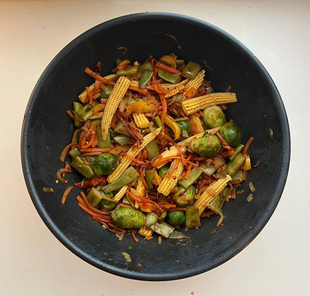 В такое холодное и снежное время года особенно хочется чего-то яркого 🤩 Ингредиенты: средняя морковь, крупная луковица, болгарский перец, кукурузы мини, европейской фасоли, брюссельской капусты, специи для овощей на гриле Способ приготовления: Лук нарезать полукольцами, морковь и болгарский перец (у меня две половинки) - соломкой, кукурузу можно разрезать вдоль или поперёк, либо оставить целой. Лук с морковью обжаривать на сильном огне пару минут, добавить перец. Через пару минут добавить фасоль, обжаривать минут 7. Добавить капусту и кукурузу, специи, по желанию - соль. накрыть крышкой и обжаривать ещё 5-7 минут. Приятного аппетита).