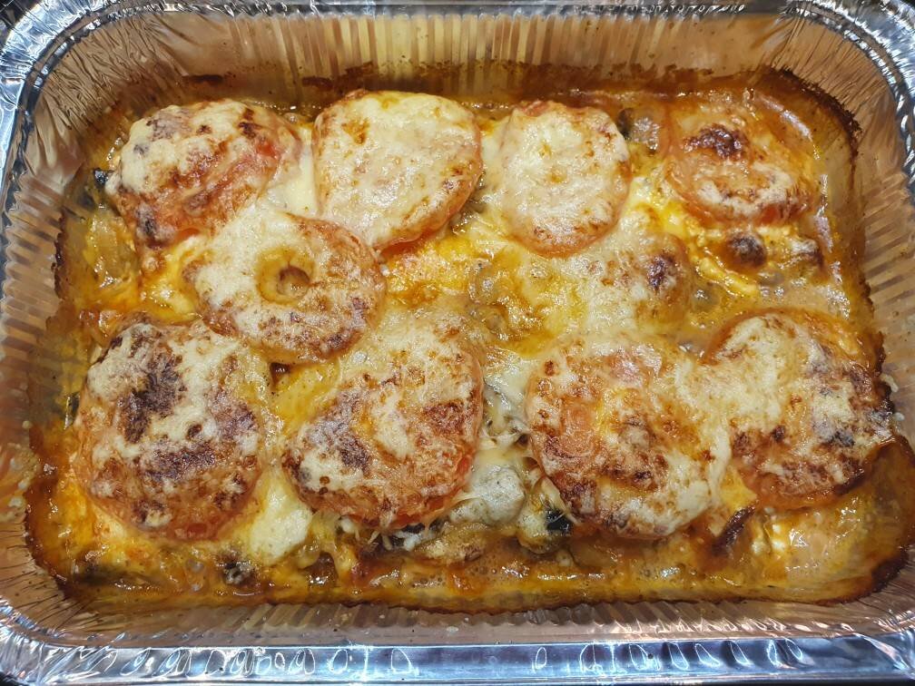 Ингредиенты: филе белой рыбы, шампиньонов (вешенок), творожного сыра, твердого сыра, луковица, небольшие помидорки, Томатная паста, Соль, Черный молотый перец, Приправа для рыбы, Оливковое масло для жарки, Сливочное масло для смазывания формы Способ приготовления: Подготавливаем продукты. У меня филе пангасиуса. Шампиньоны и лук очищаем. Нарезаем лук полукольцами, шампиньоны крупными кусочками. На разогретой сковороде без масла обжариваем до легкой румяности шампиньоны, затем добавляем немного масла, и закладываем лук, слегка подсаливаем и перчим. Жарим до полуготовности лука. Рыбу нарезаем порционными кусками и выкладываем в форму для запекания, смазанную сливочным маслом. Рыбу смазываем томатной пастой. Солим и перчим по вкусу, посыпаем приправой для рыбы. Сверху выкладываем луково-грибной слой и творожный сыр порционно. На верх раскладываем ломтики помидора (без кожицы) и посыпаем мелко натертым твердым сыром. Ставим в разогретую до 180-200 градусов духовку на 30-35 минут.
