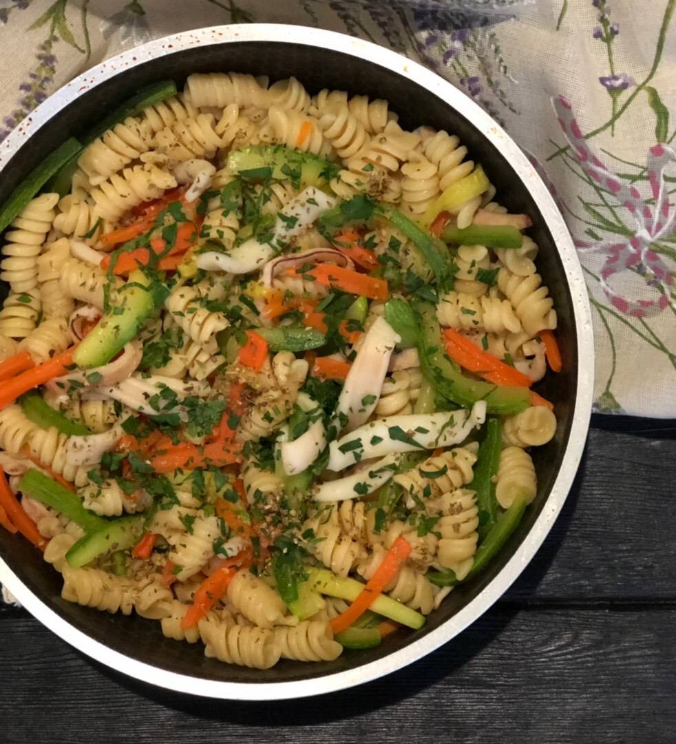 С макаронами можно готовить не только привычную всем пасту с соусами, но и тёплые салаты с овощами и ароматными травами. Попробуйте и вам обязательно понравится. Ингредиенты: макароны фузилли (спиральки), небольшой кальмар, средняя морковь, средний кабачок, петрушка, чеснок, оливковое масло, лимонный сок, орегано (сушёный) , соль, свежемолотый чёрный перец Способ приготовления: Очищенную морковь и кабачок нарезать тонкой соломкой. Кальмар очистить от кожи и внутренностей, также нарезать соломкой. Чеснок раздавить ножом и очистить, листья петрушки мелко порубить. В сотейнике вскипятить воду, положить морковь и варить 5 минут, затем добавить кабачок и варить ещё 3 минуты. Откинуть овощи на дуршлаг, дать стечь воде и сбрызнуть лимонным соком. В другой кастрюле в кипящей подсоленной воде отварить макароны до состояния аль денте, откинуть на дуршлаг. Тем временем, пока варятся макароны, в сковороде разогреть оливковое масло и обжарить зубчик чеснока до появления аромата, 30 секунд. Чеснок у
