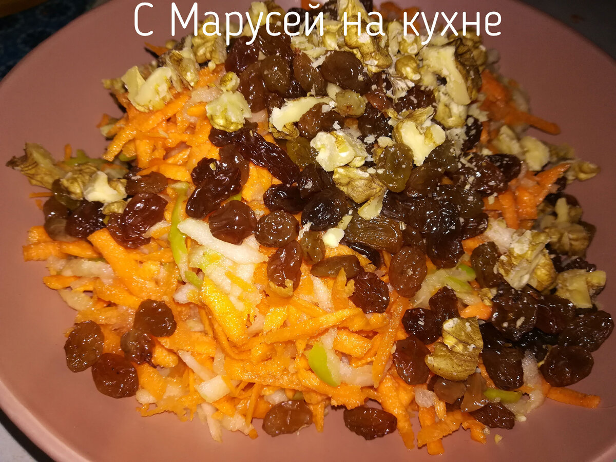 Доброе время суток моим дорогим подписчикам, и всем кто зашёл на мою страницу! Меня зовут Марина, и я очень рада каждому из вас! Не секрет, что в зимних овощах и фруктах витаминов очень мало. А их так не хватает нашему организму. Под конец зимы очень часто, из-за недостатка солнца, витаминов и свежего воздуха наступает авитаминоз. Сегодня я хочу предложить Вашему вниманию очень простой рецепт рецепт салата который, благодаря составу продуктов, прекрасно подойдёт для этого времени года. Такой салат нравится и взрослым и детям. *** Необходимые ингредиенты : МОРКОВЬ - 2 ШТУКИ ЯБЛОКО - 1 ШТУКА ИЗЮМ - 0,3 СТАКАНА ОРЕХ ГРЕЦКИЙ ОЧИЩЕННЫЙ - 2 СТ. ЛОЖКИ САХ.ПЕСОК - 1 ЧАЙНАЯ ЛОЖКА (ПО ЖЕЛАНИЮ) *** Грецкие орехи мелко нарезаем. Изюм хорошо промываем холодной водой. Если изюм слишком сухой, его можно замочить в горячей кипячёной воде (не выше 70°) на 15 минут. После этого сливаем воду и слегка обсушиваем изюм. Тщательно моем морковь и яблоко. Яблоко можно очистить от кожуры, но в наш