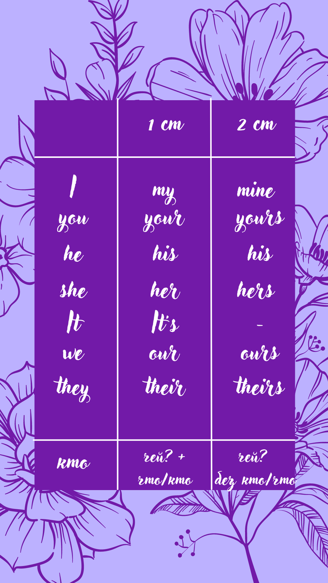 Когда же пишется "my", а когда "mine"? "my" пишется когда после него в предложении стоит существительное. Например: My pen. А "mine" когда этого существительного нет. Например: - Чья? - Mine (моя) Если у вас в предложении нет того о чём вы говорите, то нужно воспользоваться 2-ым столбиком. Например: это моё. Свой = чей. Например: Он моет свою машину. Так-же есть 3-ий столбик. Это основа английского языка. Me, you, him, her, it, us, them - отвечают на любой вопрос кроме "чей?" - кого? кому? кем? с кем? о ком? к кому?