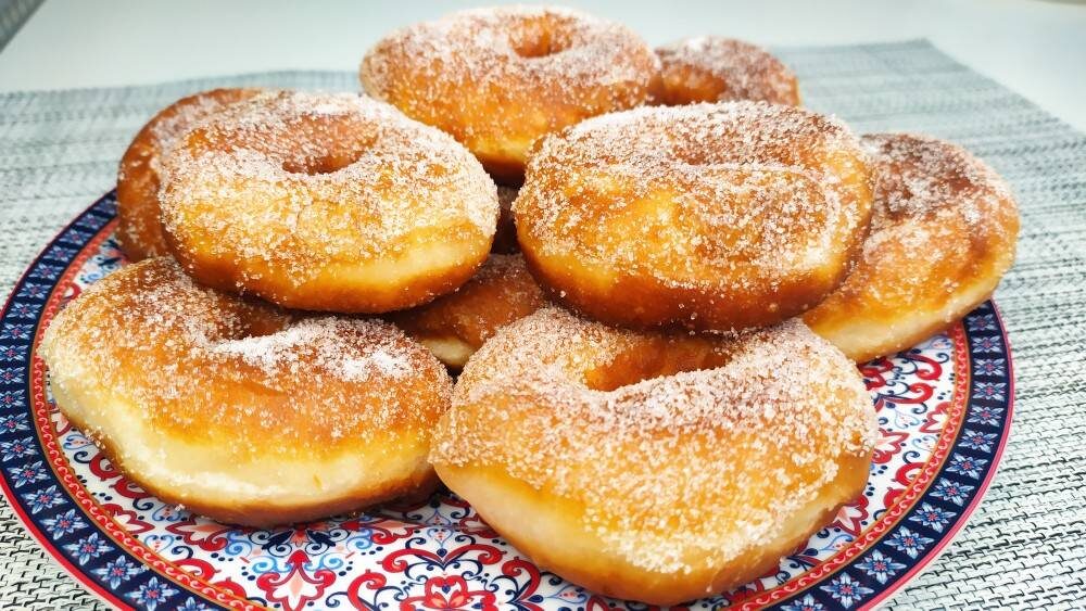 Ингредиенты: муки, молока, сухих дрожжей, сахара, соли, сливочного масла, ванильного сахара Способ приготовления: Я делаю тесто просто. Смешиваю все ингредиенты в миске. И замешиваю с помощью миксера. Можно замешать руками. Готовое тесто хорошо отстаёт от стенок посуды. Мягкое и эластичное. Накрываю тесто пищевой плёнкой и убираю в тёплое место на 40 - 60 минут. Подошедшее тесто выкладываю на поверхность, смазанную растительным маслом. Тесто разделяю на шарики величиной с куриное яйцо. Каждый шарик расплющиваю и проделываю внутри отверстие. Когда все пончики сформированы, обжариваю их в большом количестве растительного масла, начиная с первого. Жарятся пончики по 2 минуты с каждой стороны. Горячие пончики окунаю в сахарный песок. Приятного аппетита!