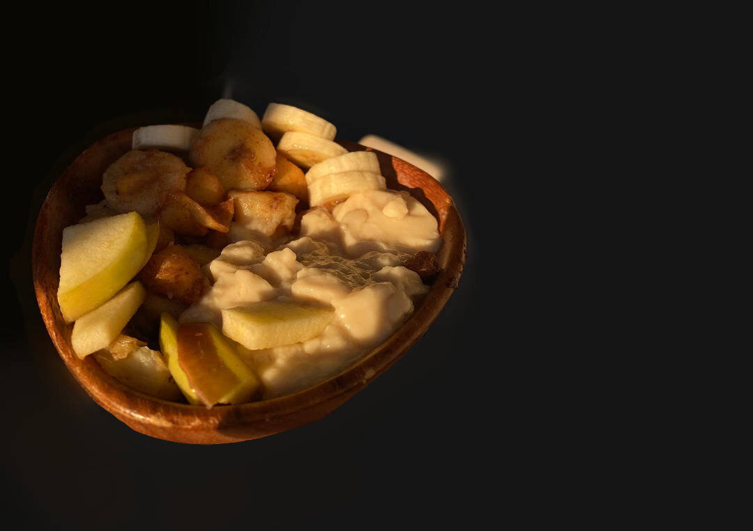 Легкий и питательный завтрак или десерт. Ингредиенты: пудинга, яблоко, банан, Корица, Сахар, Масло Способ приготовления: Яблоко разделить на пополам. Одну половину почистить и нарезать кубиками, другую просто нарезать дольками. Банан почистить, нарезать кружочками. На сливочном масле прижарить яблоки (средний огонь), сверху присыпать сахаром и корицей, тушить минут 10. Спустя 10 минут добавить пол банана и жарить еще минут 5. В тарелку поместить пудинг, пол свежего яблока и пол свежего банана. Сверху положить тушеные яблоко с бананом. По желанию посыпать орехами или гранолой, дополнительно корицей.