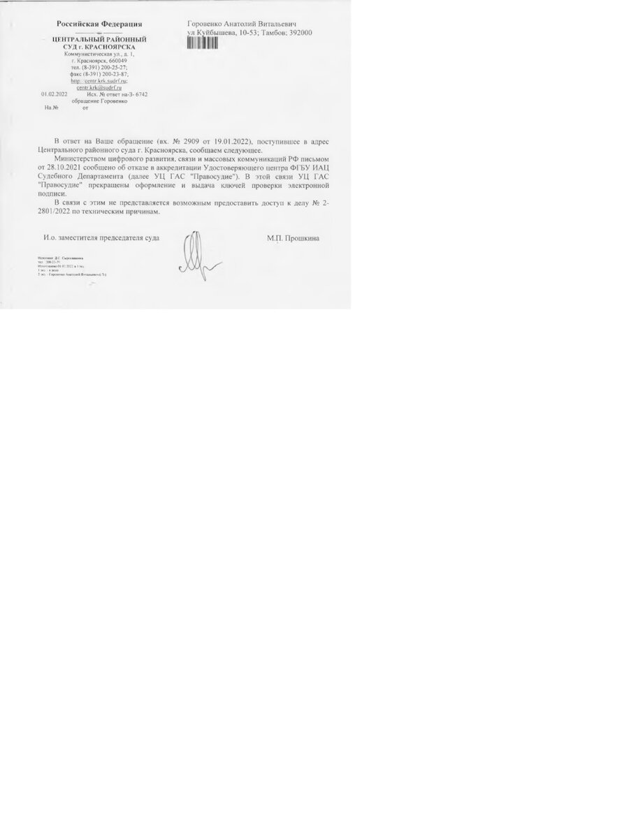 Министерством цифрового развития, связи и массовых коммуникаций РФ письмом от 28.10.2021 сообщено об отказе в аккредитации Удостоверяющего центра ФГБУ ИАЦ Судебного Департамента (далее УЦ ГАС "Правосудие"). В этой связи УЦ ГАС "Правосудие" прекращены оформление и выдача ключей проверки электронной подписи. В связи с этим не представляется возможным предоставить доступ к делу № 2-2801/2022 по техническим причинам. Вот это да!