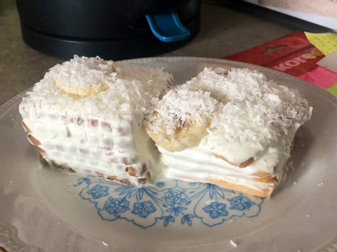 Ингредиенты: Печенье без сахара для диабетиков (ксилит, сорбит и т.д.), Сметана, Кокосовая стружка, Банан, Цикорий или какао Способ приготовления: Смазать печенье сметаной, дать постоять. Украсить сверху 👆 кокосовой стружкой, бананом, жидким цикорием или какао.