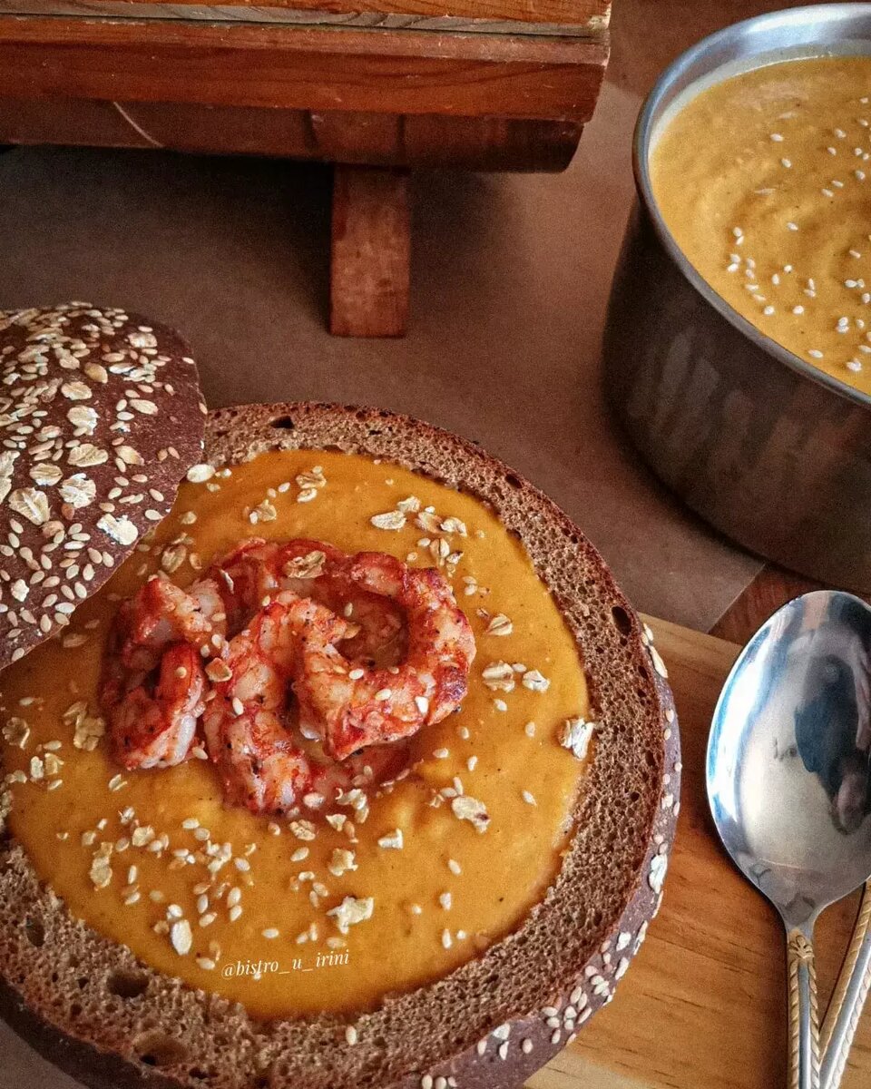 Сливочный крем-суп из тыквы с бархатной текстурой и насыщенным ароматом специй. Это - сытный, густой суп, имеющий очень оригинальный и необычный вкус. Но сегодня я решила не просто хорошо накормить своих близких, но и удивить! Использовав вместо простой тарелки для супа – хлебную! Мы приготовим вкусный тыквенный суп-пюре и подадим ее в круглой буханке хлеба . Так же этот суп можно подавать и в обычной суповой тарелке, но тогда лучше всего с сухариками. #первыеблюда #супы Ингредиенты: Тыква , Лук , Морковь , Вода , Сливки 10% , Чеснок , Креветки , Специи (соль, перец, тмин, кориандр, карри) Способ приготовления: Крупно нарезанный лук и морковь обжариваем в оливковом масле до золотистости. Тыкву чистим. режем на кубики размером приблизительно 2 на 2 см, кладем в кастрюлю, заливаем водой и ставим на средний огонь до закипения. Сразу вслед за этим добавляем в суп обжаренные овощи и специи. Доводим суп до кипения. Когда закипит - уменьшаем огонь и варим еще 5-7 минут до мягкости тыквы. Зате