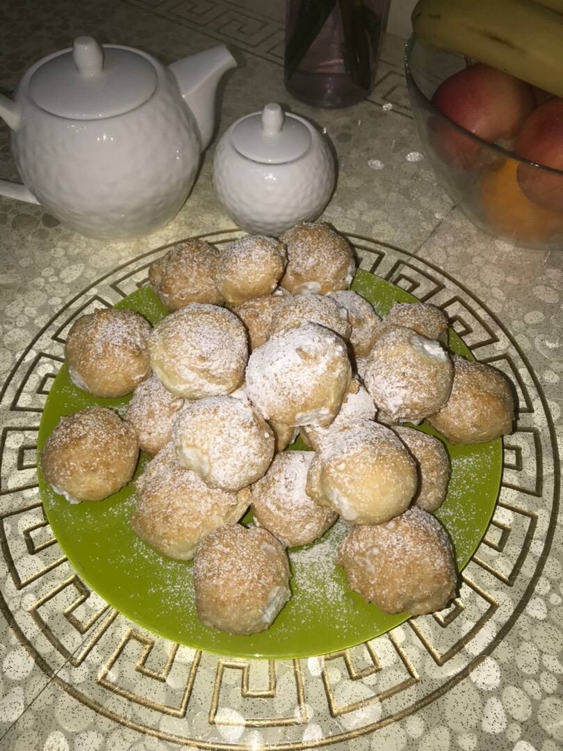 Я думаю, профитроли любят и взрослые, и дети! Крем для заварных пирожных можно приготовить любой, какой вы любите, например со сгущенкой. Но я предлагаю вам сделать профитроли со сметанно-творожным кремом. Ингредиенты: Для теста, воды, Масло сливочное , Мука, Соль , яйца, Для крема, Сметана , Творог , Сахарная пудра Способ приготовления: Наливаем стакан воды в кастрюлю и ставим на огонь. Стакан муки просеиваем. Масло я растапливаю в микроволновке. Добавляю масло в воду, туда же соль. Доводим до кипения. Добавляем в воду с маслом муку, постоянно перемешивая. Оставляем минуты на 2 на небольшом огне, хорошо перемешивая тесто. Остужаем. Яйца разбиваем и слегка перемешиваем венчиком. Постепенно вводим яйца в заварное тесто, перемешивая до однородности после каждой порции. (Можно просто добавлять яйца по одному.) Тесто будет как бы делиться на кусочки, но потом образуется однородная масса. Я перемешивала вилкой, слегка наклонив кастрюлю. На противень кладем лист пергамента, слегка смазываем