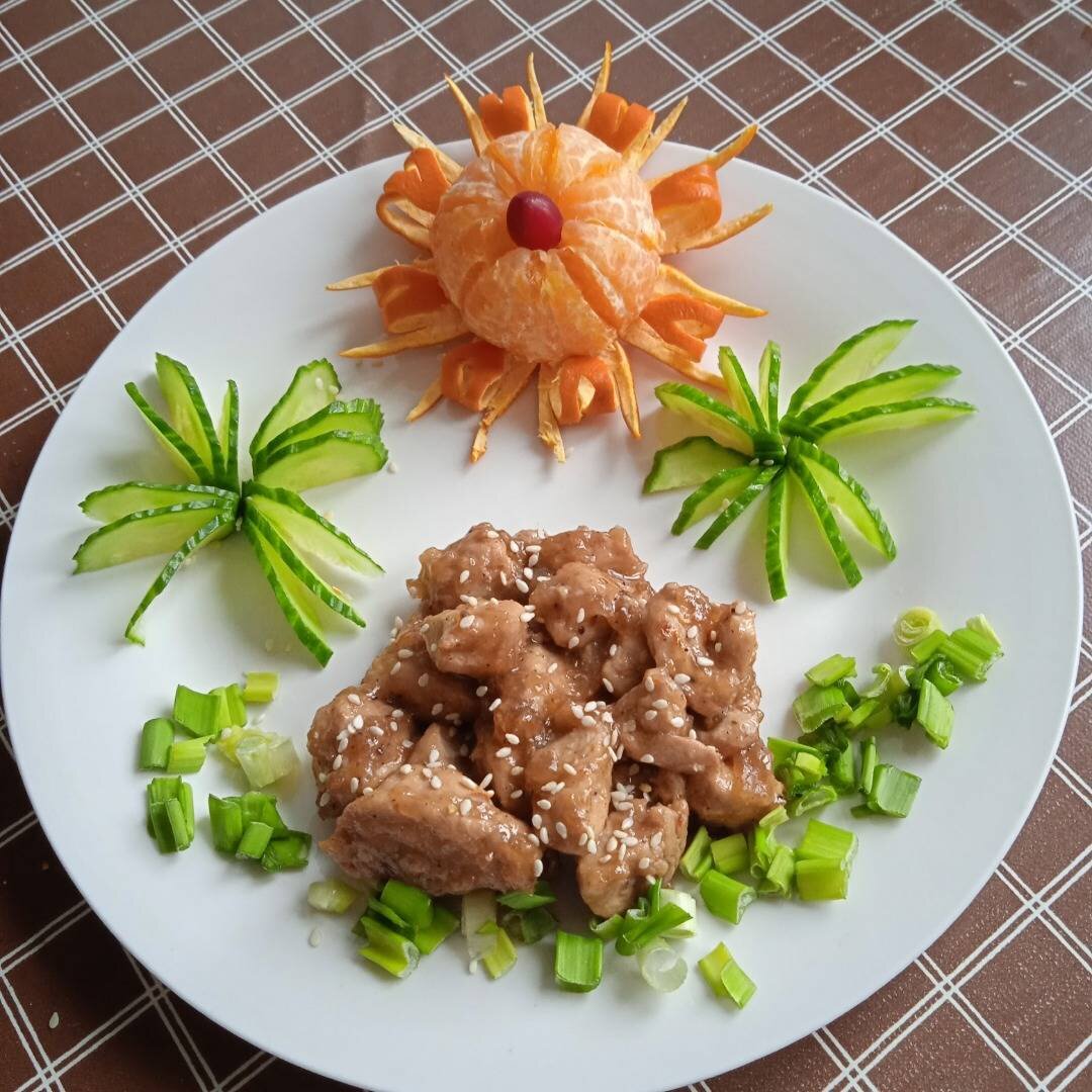 Курочка получается очень мягкая, сочная, нежная, с приятным остреньким соусом. При подготовки всех ингредиентов, готовится очень просто и быстро. #курица Ингредиенты: куриного филе, имбиря, чеснока, чёрного перца, перца чили, корицы, сахара, соевого соуса, крахмала (крахмал любой), холодной воды, кунжут, зелёный лук, острый красный перец (для украшения), растительное масло для жарки Способ приготовления: Куриную грудку помыть, обсушить бумажным полотенцем, порезать небольшим кубиком (2х2 см.). В сковороду налить растительное масло, обжарить курицу на сильном огне 5-7 минут. Добавить натёртый на мелкой тёрке, имбирь, чеснок, пропущенный через пресс, готовить 1 минуту, на среднем огне. Затем добавить чёрный перец, чили, корицу, сахар, влить соевый соус и крахмал, разведённый в 100 мл. воды, готовить 2 минуты, на слабом огне. Выключить огонь, по желанию, посыпать филе кунжутом, порезанным зелёным луком, посыпать порезанным острым перчиком.