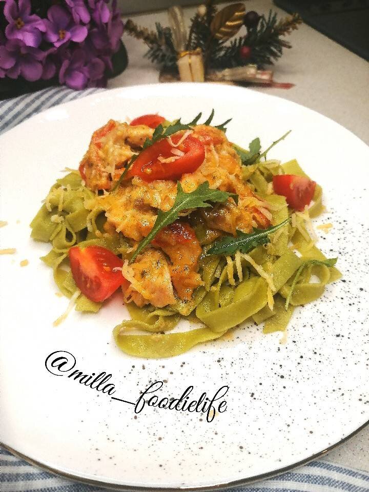 #курица Ингредиенты: феттучини со шпинатом, филе курицы, черри, сливки 10%, соус песто, соль, перец, Для жарки масло растительное, сыр пармезан Способ приготовления: Куриную грудку нарезать полосками. Черри разрезать на 4 части. На разогретой сковороде с растительным маслом обжарить курицу до золотистой корочки, слегка приправив солью и перцем по вкусу, добавить нарезанные помидоры черри, перемешать. Влить сливки. Добавить соус Песто (❗с соусом аккуратно, он очень калорийный и достаточно соленый, по этому регулируйте вкус под себя, добавляйте 1 или 2 может и 3 ст л❗), перемешать, тушить минут 5 Далее добавить натёртый пармезан (или любой др твёрдый сыр), перемешать, тушить минуты 3. Пока готовится соус, отварить феттучини в подсоленной воде до состояния аль денте. Выложить на тарелку для подачи пасту с курицей и соусом песто, присыпать натёртым сыром, можно подавать Приятного аппетита, друзья ❤️