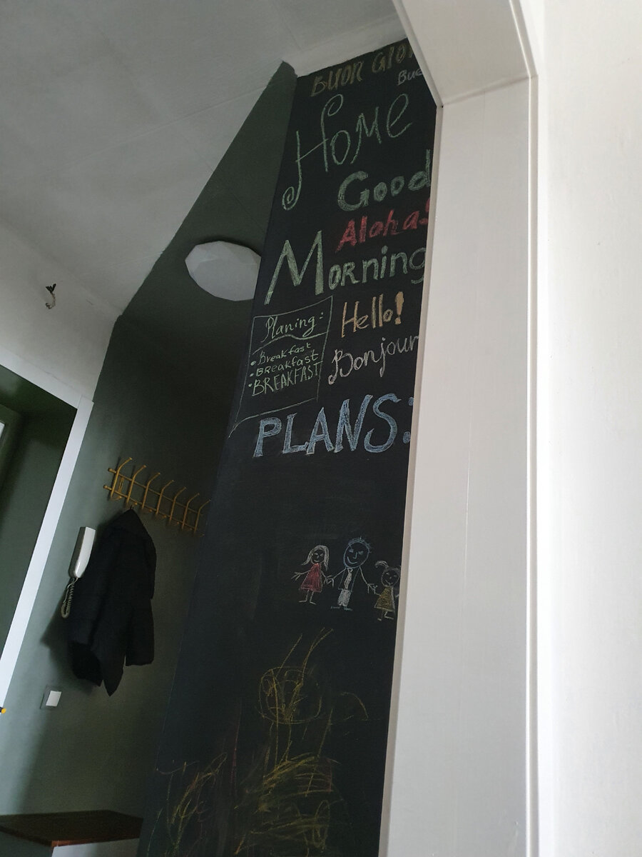 #chalkwall или Меловая стена Как можно сделать такую стену своими руками? Очень просто! Причём необязательно тёмного цвета, главное чтобы цвет был насыщенный, тогда на нем будет лучше виден мел) Инструкция проста, хотя в действительности придётся немного поморочится. Нужно подготовить поверхность, если у вас большие выбоины и дыры в стене,тогда стоит воспользоваться гипсовой штукатуркой. После необходимо загрунтовать стену. Если стена более менее однородна, то можно сразу шпатлевать(без штукатурки), я использовала обычную готовую финишную из леруа. Далее шлифовка до нужного состояния стены, желательно чтобы стена была гладкой,проще всего использовать либо шлифмашинку, либо шлифдиск на дрель, руками конечно намного сложнее,хотя без этого все же никуда, придётся "дорабатывать" точечно многие участки,скорее всего останется ещё немного "пробелов", поэтому опять грунтуем и шпаклюем, затем снова шлифуем до ровного состояния стены. Дальше я снова загрунтовала стену и после высыхания начала