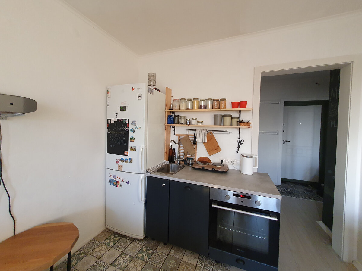 Кухня в которой нашлось место для полноценного холодильника,духовке 60×60,мойке и даже посудомойке🤨 чего то не очень верится правда? И да тут стоит отметить несколько оговорок. На фото не видны все места хранения, еще есть целый стеллаж и полка в гардеробе-кладовке 🤪, но я сразу могу сказать, все что я храню в тумбе и на полке точно бы влезло в верхние кухонные шкафы до потолка плюс еще бы было дополнительное место и опять таки были свои резоны не делать этого). И я не шучу🤗 кто-то может сказать что я наверняка мало готовлю,раз у меня так мало вещей, но это не так! Наша семья из трех человек и готовлю я достаточно много:как говорится люблю готовить первое,второе и компот- и всего этого не хватает на неделю. Тогда возникает весьма здравый вопрос, почему же у меня все кухонные принадлежности занимают так мало места? Я стала относится ко всем кухонным принадлежностям рационально,остовлять только те кострюльки которые использую,плюс они со съмной ручкой,плюс их мало,но у них оптима