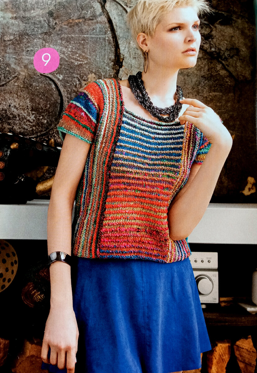 Размеры: S (M, L, XL) Размеры готового изделия Обхват груди 89 (99, 109, 119) см Длина 51 (54, 57, 60,5) см Вам потребуется: 5 (6,7,8) мотков пряжи Noro Koromo (39% хлопка, 35% шерсти, 26% шёлка. 125 м/50 г) цвета №3, круговые спицы №4, маркеры. Пряжу можно подобрать любую. Укороченные ряды: см. модель №3. Узор в полоску: вязать от 2 мотков, чтобы полосы были контрастных цветов. 1-й и 2-й р.: нитью от 1-го мотка связать 2 р. лиц. п. 3-й р.: нитью от 2-го мотка связать 1 р. лиц. п. 4-й р.: нитью от 2-го мотка связать 1 р. изн. п. Повторять 1-й – 4-й р. Плотность вязания, узор в полоску спицами №4: 17 п. и 28 р. = 10 * 10 см. Топ состоит из 4 деталей: Средняя деталь спинки: набрать 32 (34, 38, 40) п., вязать узором в полоску до высоты 48 (51; 53,5; 56) см. Закрыть петли, как лиц. Средняя деталь переда: набрать 32 (34, 38, 40) п., вязать узором в полоску до высоты 39,5 (43; 45,5; 48) см. Закрыть петли, как лиц. Правая боковая деталь: начиная с нижнего края, набрать 81 (85, 90, 94) п. по