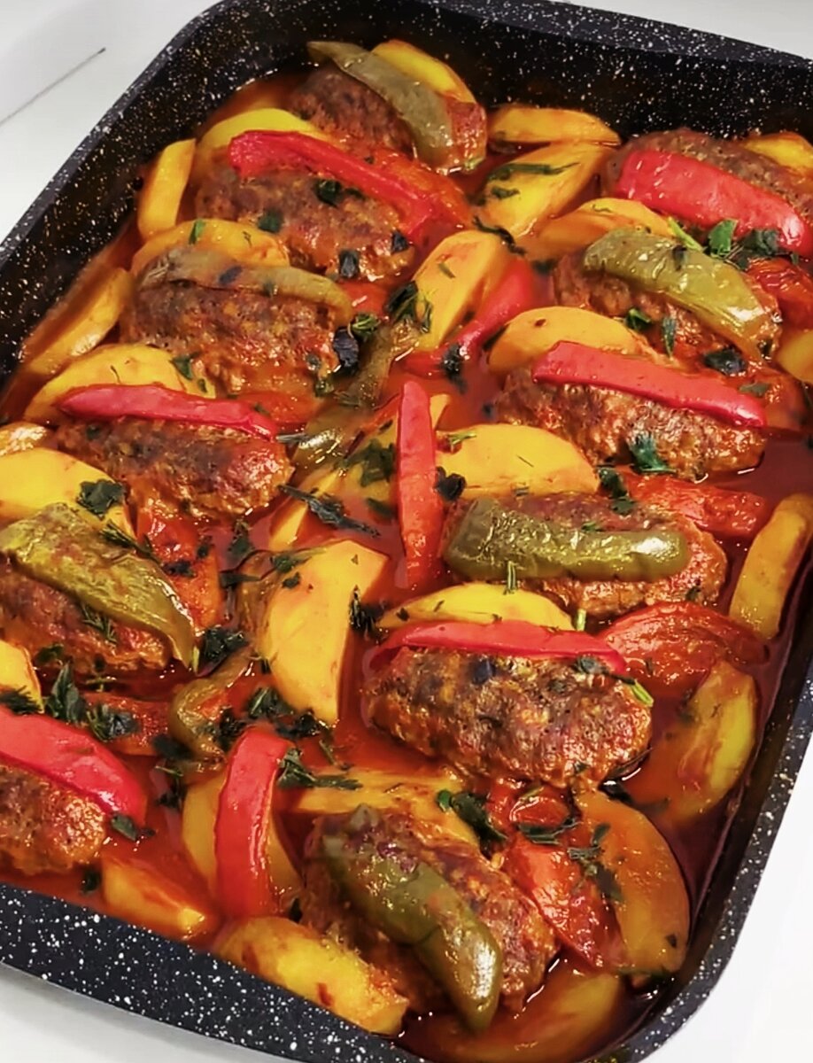 Здравствуйте, уважаемые читатели моего канала. Знаете, что самое тяжёлое в работе домохозяйки? Мне кажется, что это не сами физические действия по уборке дома, приготовлению еды итд, самое тяжёлое, на мой взгляд, ежедневно придумывать, что приготовить! Кажется, что в связи с многолетним опытом уже обладаешь такими знаниями различных рецептов, что хоть каждый день делай что-то новое и год не повторяйся, но по факту каждый день стоишь перед холодильником, проклиная всё и думаешь, что же сегодня приготовить на ужин. Хочу вам немного помочь с одним из вариантов на ближайшие ужины. Случайно нашла в одном кулинарном блоге рецепт этого горячего блюда и могу вам сказать,что это очень вкусно и оригинально. Итак, сегодня готовим "Яркое горячее", что же нам понадобится? Ингредиенты: Говядина фарш -1 кг Лук средний -2 шт. ( пропустить через мясорубку) Яйцо-1 шт. Специи по 1 ч. л. - красная паприка, чёрный перец, смесь для мясо и соль Зелень разная- пучок. Картофель -6-7 шт. Помидоры -2-3 шт. Пер