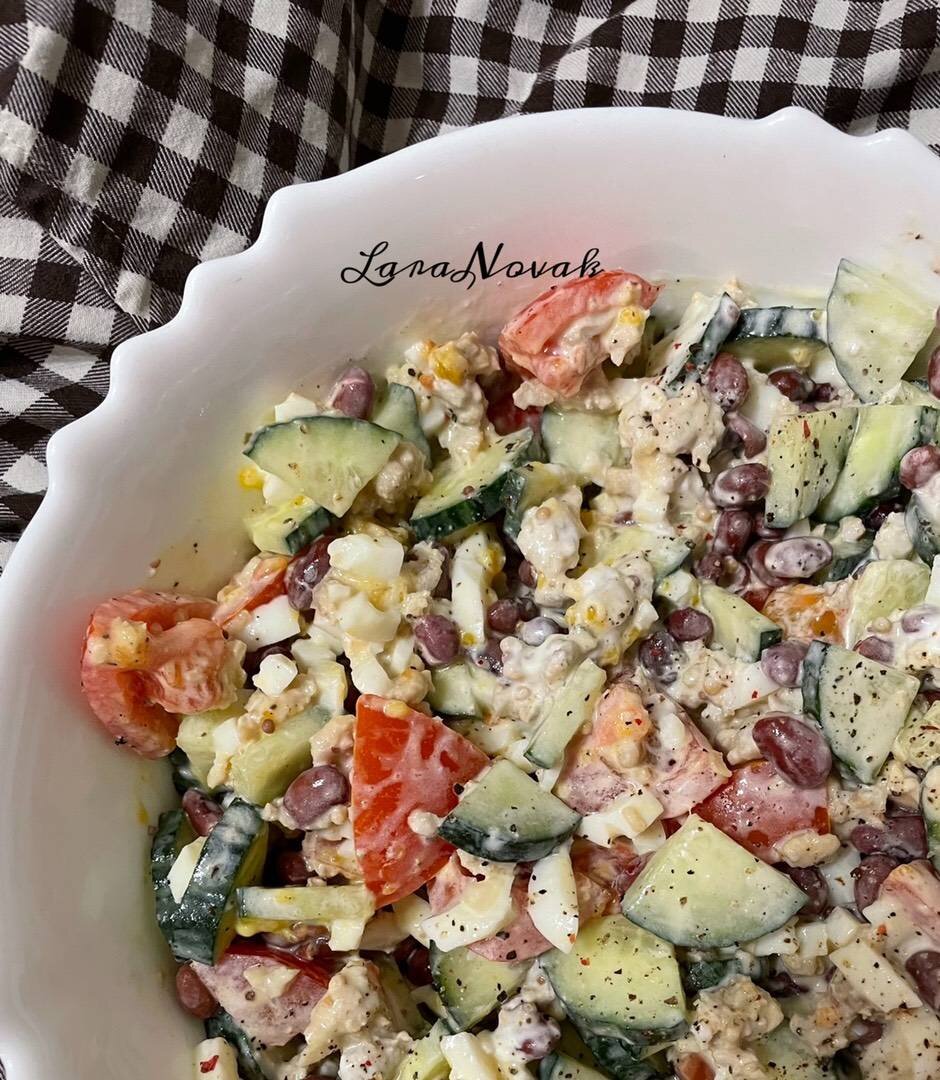 Пробовали салат с мясным фаршем? Нееет, вы не ослышались. Получилось просто фаршебно! Вкуснее вкусного, легче легкого 😋👌👍 Ингредиенты: большой огурец, сливовидных помидоров, яйца вареных, фарша (у меня из филе грудки и бедра индейки), приправа для фарша, консервированной фасоли, сметаны, французской горчицы (в зёрнах), соль, смесь перцев Способ приготовления: Приготовить все необходимые ингредиенты. Обжарить фарш с приправой на хорошо разогретой сковороде до готовности. И пока остывает фарш, нарезать в салатник помидоры и огурцы, добавить консервированную фасоль (я ее промываю в дуршлаге под проточной чистой водой, затем просушиваю бумажным полотенцем или даю воде стечь) Далее нарезать кубиком (или через яйцерезку) вареные яйца и добавить их в салатник к овощам. В конце приготовления высыпать готовый фарш и заправить сметаной+горчицей, по вкусу добавить соль, перец. Все тщательно перемешать и наслаждаться 😊👍Приятного вам аппетита