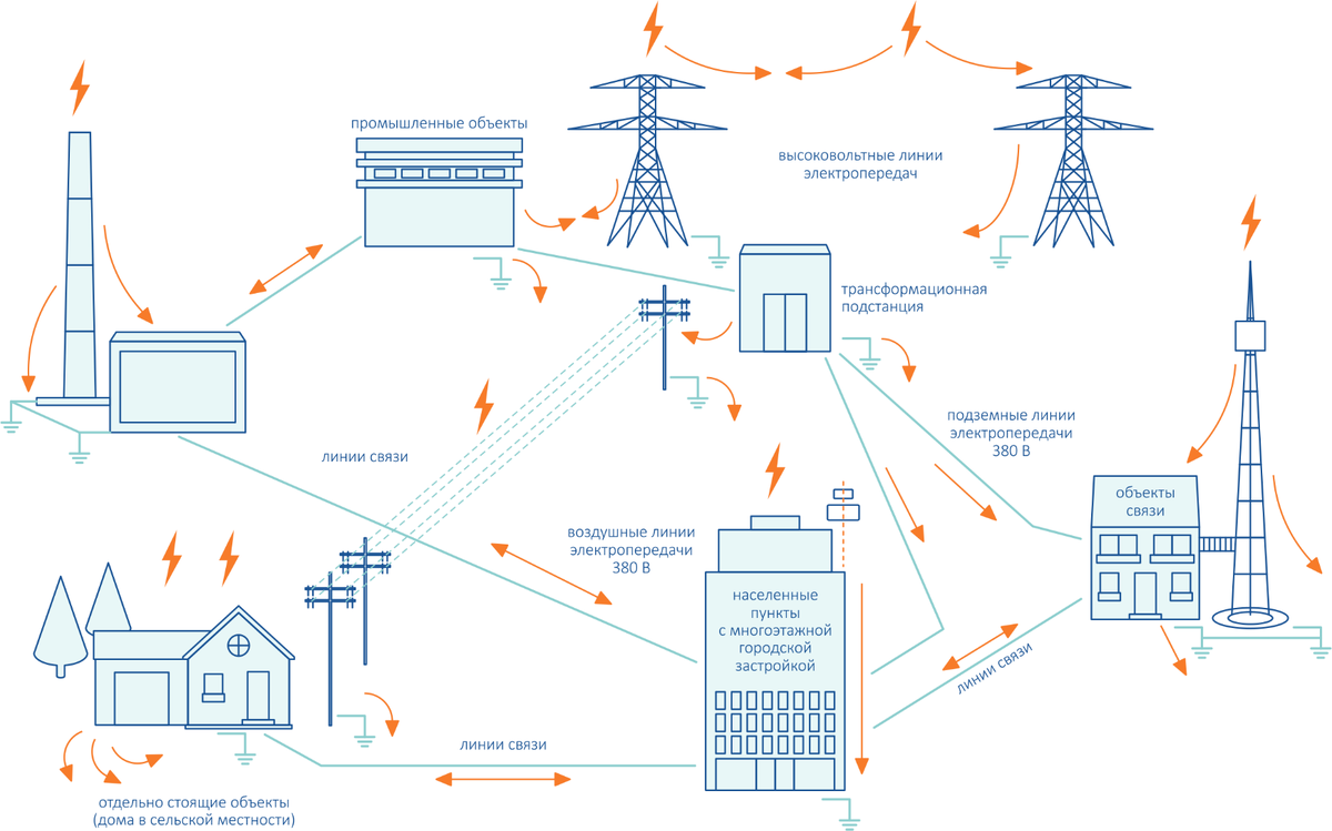 Импульсными источниками перенапряжений, вызывающих повреждения электрооборудования, являются: Большинство зданий, сооружений и их внутреннее оборудование так или иначе объединены между собой – кабельными коммуникациями, водопроводными трубами, через систему заземления и т.д. Поэтому молния и связанные с ней электромагнитные поля оказывают сильное влияние не только на электрооборудование пораженного объекта, но и на оборудование, размещенное поблизости. По результатам регистраций известно, что максимальные значения токов молнии могут составлять 200-300 кА, однако средние значения составляют величины порядка 30 кА. Прямые измерения показывают, что с вероятностью 50% ток молнии не меньше 30 кА, у 5% молний (сильные молнии) он превосходит 80 кА и у тех же 5% (слабые молнии) меньше 15 кА. Молний с током 100 кА фиксируется меньше 2%, а молнии с током 200 кА настолько редки, что их вероятность оценивается только очень приблизительно. Так при ударе молнии с током 30 кА в здание с сопротивление