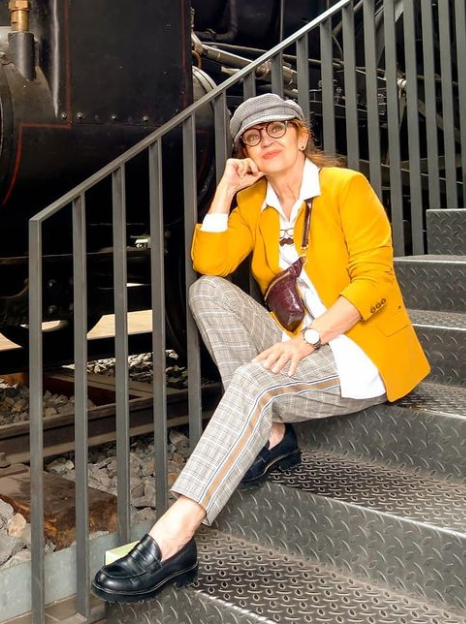 - Не нужно одеваться как попугай во все цвета радуги, достаточно добавить в обычный комплект один яркий элемент. Так, в этом примере использованы светло-серые брюки из ткани в неконтрастную клетку с бежево-золотистыми лампасами, белая рубашка, надетая навыпуск, чёрные лоферы и светло-серая стильная кепка. Ярким элементом выступает пиджак насыщенного жёлтого оттенка, образ дополняет красно-коричневая сумка.