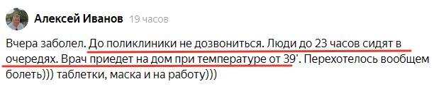 Путин виноват. Ну если не Путин, то Мишустин. Если не Мишустин, то Голикова и Попова)) Но вообще за все в стране отвечает президент, по крайней мере, если это нормальный, хороший и ответственный президент. ну как у нас)) Вот обстановка с вызовами врачей: Я тоже заболел, и по всей видимости ковидом. Тест пока не готов. Но когда пришел врач, я предложил ему сразу взять анализ у всех членов семьи. Врач отказался, типа нужно оформлять отдельные вызовы. Ну и что же? Естественно, на следующий день заболела жена, дети непонятно (видимо переболели до нас). От одного ребенка, наверное, заразился я, жена от меня. Другой ребенок пока держится, по крайней мере, никаких симптомов. Вызвал врача жене, сразу вызвал врача детям, кроме грудничка. Теперь понимаете почему очереди в поликлиниках и люди на улице стоят, как во времена СССР? Потому что, вместо того, чтобы взять тесты у всех членов семей, врачи ходят по отдельности к каждому. Следующий момент. Когда болели в прошлый раз, врача вообще не вызыв