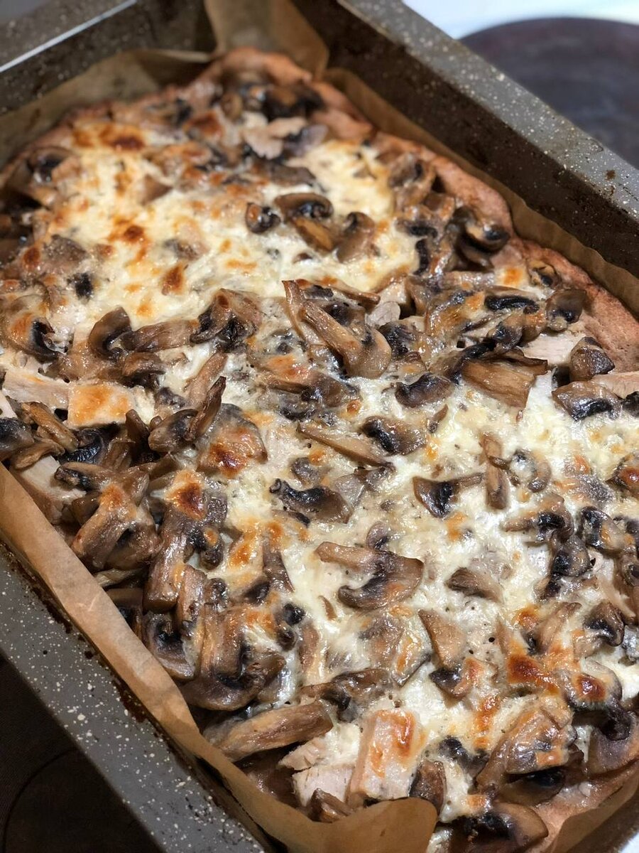 Нам понадобится: Мука цельнозерновая - 80 гр; Яйцо - 1 шт; Куриное филе - 100 гр; Сметана 15% - 2 ст.л; Сыр твердый - 25 гр; Шампиньоны - 200 гр; Масло -0,5 ст.л. Отварить куриное филе, в подсоленной воде, охладить до комнатной температуры. Приготовить тесто. В глубокой миске соединить муку, яйцо и добавить воды на глаз. Вымешать тесто, оно должно получиться мягким и эластичным, накрыть пленкой и отправить в холодильник на час. Грибы промыть, крупно нарезать, обжарить на сковороде. Жарим грибы на среднем огне, чтобы шампиньоны хорошо протушились. Остывшую куриную кружку нарезаем небольшими кубиками, сыр трем на мелкой терке. Сметану и перетертый сыр смешиваем, добавляем соль по вкусу, хорошо перемешиваем, это будет заливка для нашего пирога. Форму слегка смазать маслом. Можно на дно выложить пергамент, так пирог будет легче достать. Тесто раскатываем в тонкий пласт. Рассказанное тесто выкладываем в форму. На тесто выкладываем начинку, курица, грибы, далее при помощи ложки равномерно ра