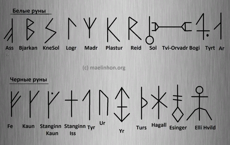 Ряд делится на две части - черный и белый ряд. Некоторые руны схожи с