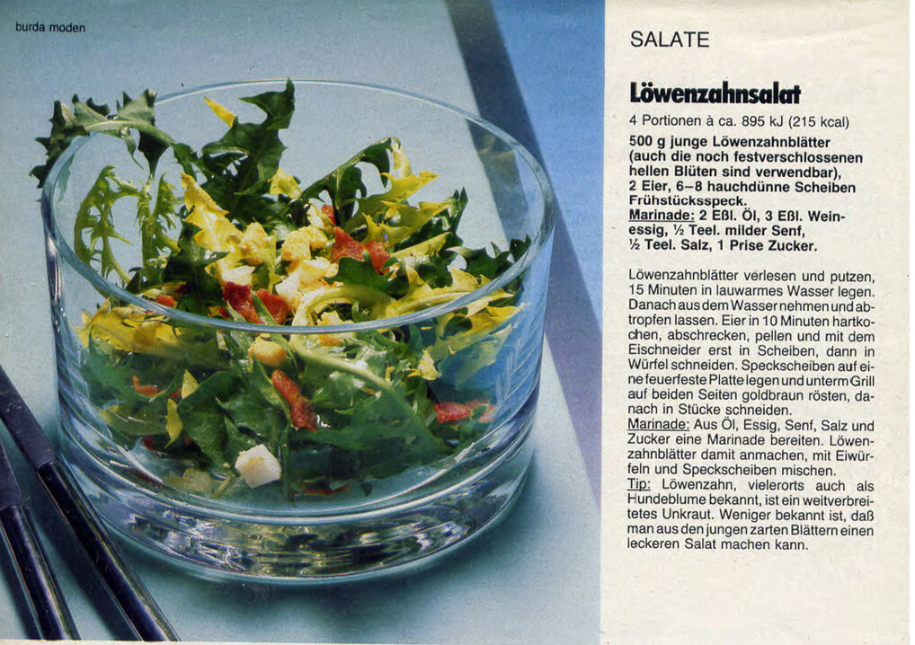 Люблю старые журналы. Особенно журналы мод. В 1985 году журнал "Бурда" у нас еще не издавался. Но он попадал к нам самыми разными путями. Привозили знакомые, которым посчастливилось побывать за границей, можно было купить у фарцовщиков. Да и сам журнал в то время был гораздо более интересный, нежели в последние годы. Каждую модель хотелось пошить или связать. Кулинарные рецепты переводили и даже пытались по ним готовить. Хотя очень часто эти рецепты удивляли и веселили. Например, Салат из одуванчиков Рецепт рассчитан на 4 порции, содержит около 895 кДж (215 ккал) Ингредиенты: 500 г молодых листьев одуванчика, также можно добавить нераскрытые бутоны цветов2 яйца, 6-8 тонких ломтиков бекона. Также можно добавить нераскрытые бутоны цветов 2 яйца, сваренных вкрутую, 6-8 тонких ломтиков бекона. Маринад: 2 столовые ложки растительного масла, 3 столовые ложки винного уксуса, % тел. мягче отправлено, пол чайной ложки неострой горчицы, пол чайной ложки соли, щепотка сахара Листья одуванчика