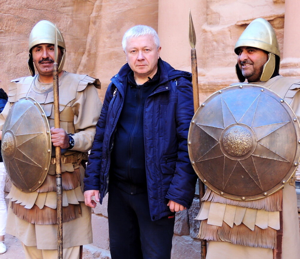 Вы когда-нибудь путешествовали на машине времени? Мне тоже не приходилось. Но, оказавшись в Петре, испытал эффект переноса во времени. Колорит дополняют набатейские воины. Вот так они выглядят. Эти двое попросили меня сфотографироваться с ними. Сфотографировался, даю по доллару, а они смеются и показывают на жену, мол, с ней тоже хотим сфотографироваться. Она не против. Сфотографировалась. Даю им по пять долларов каждому, они отводят руку, смеются и говорят: «Русо»! Сейчас, составляя этот репортаж, думаю, что как хорошо, что первой арабской страной была Иордания, а не Египет. Русских в Иордании любят. А почему воины набатейские? Ведь город был основан и стал столицей идумеев. Дело в том, что город появился при идумеях, но наибольшего расцвета достиг при набатеях, а после римлян пришёл в упадок. И что, получается, ценится больше всего: рождение, расцвет или упадок? Судя по набатейским воинам и упоминании их всеми гидами, причем многократно, ценится больше всего расцвет. Итак, Петра со в