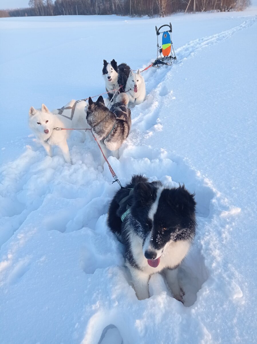 Начнем с главного – у меня сегодня просто невероятно потрясающий день!!! Семья Пирата привезла хлеб для наших питомцев. Я поехала забирать его к трассе на снегоходе (нас, как вы помните, опять завалило). И так, оторвавшись от ноутбука буквально на 15 минут, домой я вернулась только через пару часов. Привезя хлеб, запрягла собак и отправилась доставлять молоко на упряжке по заснеженным полям за пару километров. Я везу его соседям уже 2 недели. Мне самой от этого и стыдно, и смешно. Казалось бы, всего каких-то пару километров! Что может быть проще? Только вот чтобы проделать эти пару километров по пояс в снегу, предварительно вырвавшись из постоянного калейдоскопа приключений, нужно закладывать около часа. И целый мешок сил. Да еще и сделать это надо в «приличное» время, а не в 5 утра, когда я встаю, например. Вряд ли люди обрадуются, увидев меня в такое время у своих ворот, даже если привезу им бидончики козьего молока от Текилы и Сметаны. Кекс прокладывал дорогу в полях, где было тольк