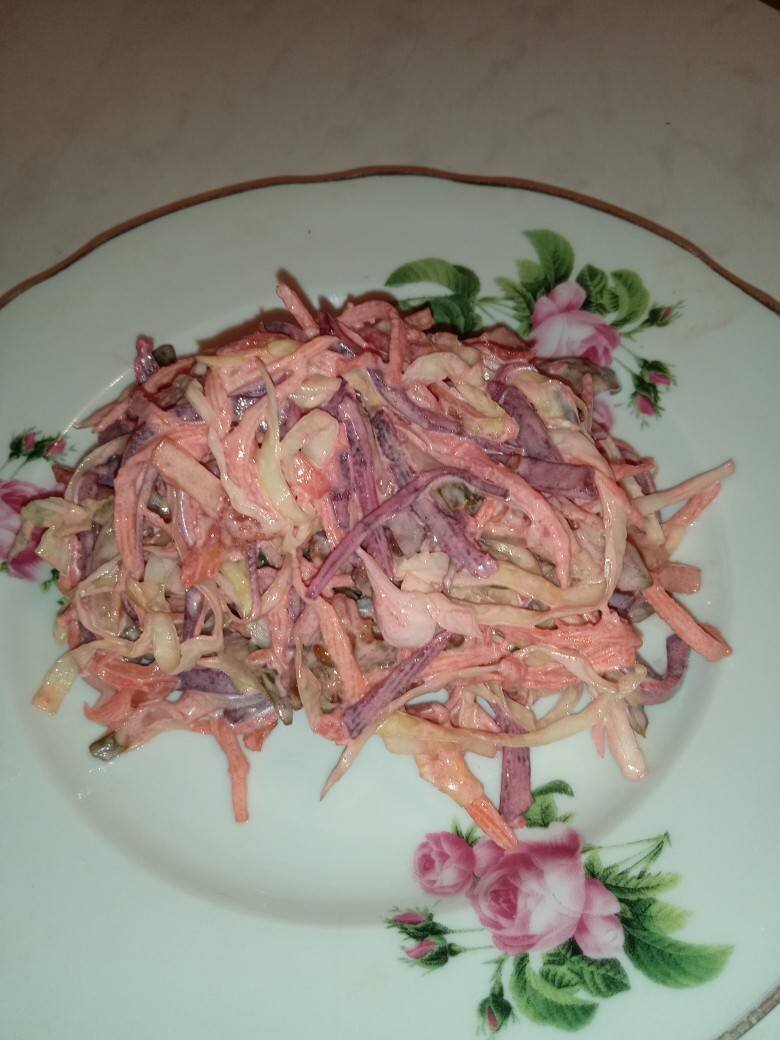 Думала, думала и решила приготовить салат французский на свой манер. Ингредиенты: Свекла (мелкая) , Морковь (не крупные) , Капуста, Мясо (у меня свинина домашняя), Картошка, Малосольный огурец, Майонез (домашний), соль , Семена льна Способ приготовления: На корейской тёрке трём свёклу, морковь. Мелко шинкуем капусту. Мелко шинкуем картофель на фри и обжариваем. Мясо режем на полоски и тоже обжариваем. В середине домашний майонез. Перемешиваем, солим по вкусу, добавляем семена льна и вуаля, получилась витаминная вкусняшка. Кушайте с удовольствием! Приятного аппетита!