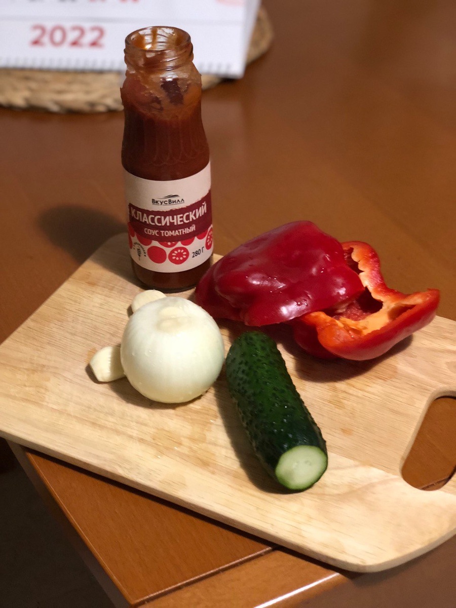 Берем: спелые помидоры - 2 шт; сладкий перец - 1 шт; чеснок - 1 зубчик; томатный сок - 100 мл; огурец - 1 шт; луковица - 1 шт; табаско - 3 капли; куриное филе - 200 гр. Все овощи хорошо промываем, ошпариваем помидоры, снимаем с них кожуру. Сладкий перец, чеснок, огурец, лук, режем и смешиваем с помощью блендера, добавляем томатный сок. Помидоры трем на терке и добавляем к смеси, перемешивая ложкой. Ставим смесь вариться на 10 минут, в конце добавляем табаско и тщательно перемешиваем. Филе отвариваем параллельно в течение 30-40 минут, затем нарезаем и добавляем к основному блюду. Приятного аппетита! Ж/У/Б 4/35/53 Ккал блюда 388