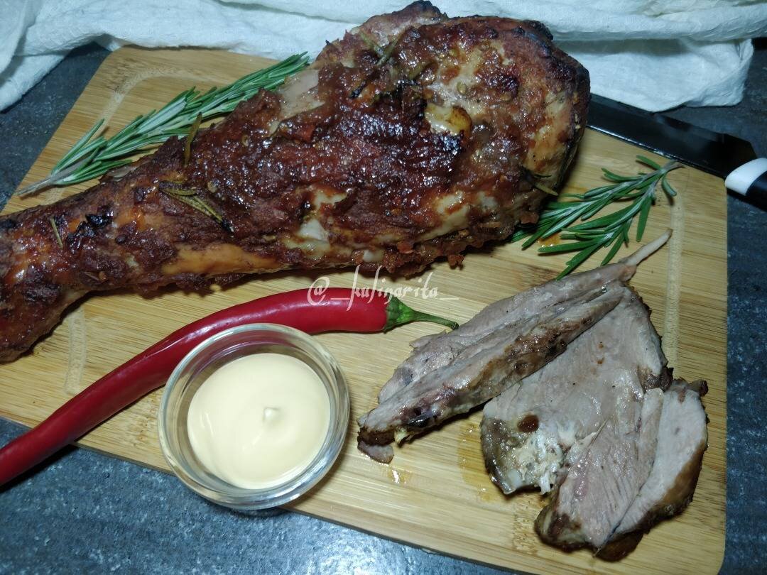 Если вы ещё не пробовали готовить голень индейки, то многое потеряли. Они получаются очень сочными и нежными. А этот маринад, как нельзя лучше подходит к индейки, да и вообще к птице. Ингредиенты: голень индейки, помидора, соевого соуса, мёда, розмарина, Соль, перец Способ приготовления: Голень индейки вымыть и обсушить бумажным полотенцем. Проколоть ножом во многих местах. Натереть со всех сторон солью и перцем. Помидоры измельчить в пюре с помощью блендера. Добавить соевый соус и мёд, взбить до однородности. Залить голень соусом, добавить листики розмарина. Оставить мариноваться на 1 час. Переложить голень на противень, запекать в разогретой до 170 градусов духовке 60 минут. Приятного аппетита!