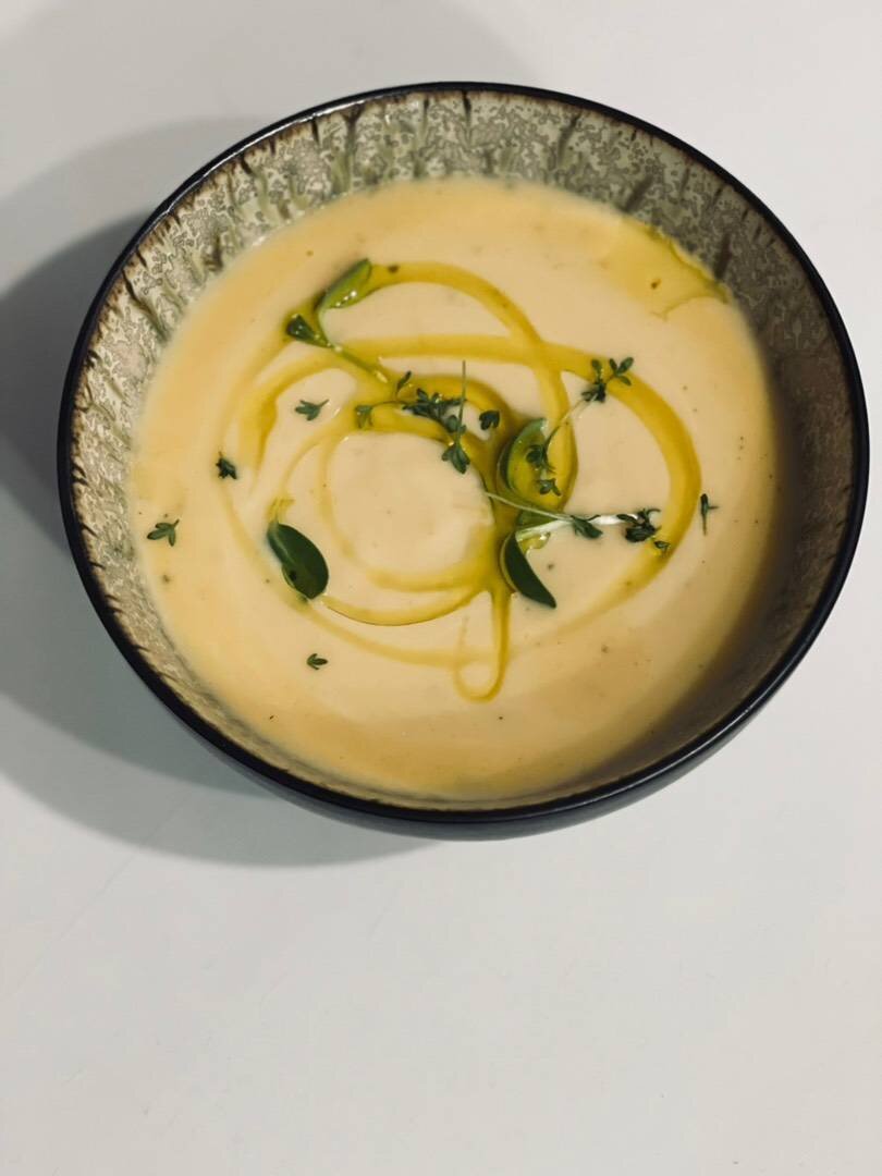 Ингредиенты: Морковь , Лук , Картофель , Сливочный сыр , Сливки 20% , Тимьян , Розмарин , Перец чёрный молотый , Соль , Оливковое масло Способ приготовления: Лук, морковь нарезаем и обжариваем на оливковом масле прямо в кастрюле Добавляем картофель и заливаем небольшим количеством кипятка, варим до готовности. Далее добавляем сыр, специи, соль. Когда сыр растворится снимаем с огня и пюрируем блендером. Вливаем сливки и доводим до кипения.