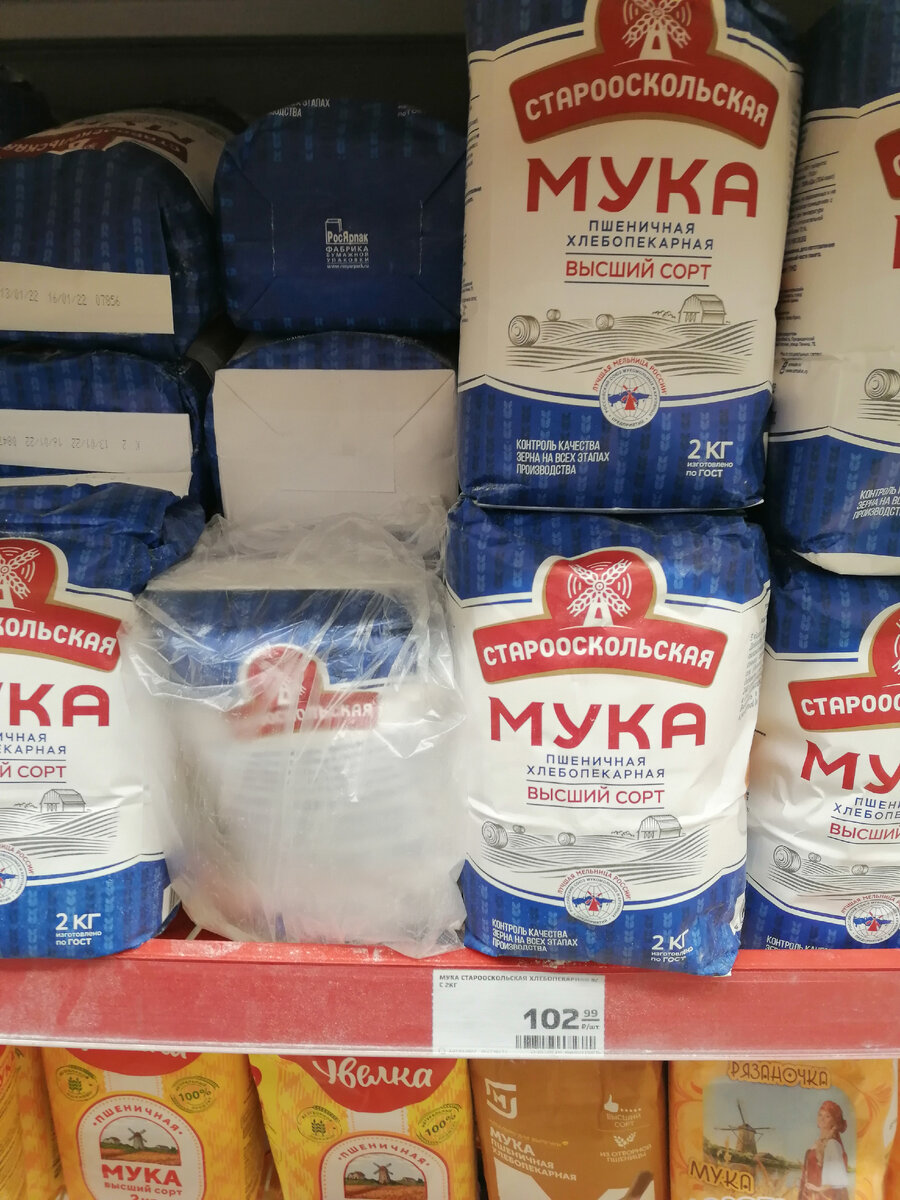 Всем добрый день! Свершился наконец - то наш первый выезд за покупками с середины января. Даже растерялась немного😁. Конечно, ничего не распланировала, меню не составила, список продуктов не написала, так, в уме прикинула. Весь месяц февраль два пенсионера будут жить на одну пенсию, её должно хватить на всё - коммунальные платежи за квартиру и дом, бензин, продукты, корм для животных и так далее. Проживем, и сравним, насколько больше можем себе позволить после январского повышения. Размер пенсии 18 214р. Ну да ладно, вроде лишнего не много потратили. Что удивительно, не заметили чтоб цены подросли (а в магазинах не были 2,5 недели), даже подешевело кое-что, хоть теже яйца. Но вот к ценам на муку это не относится. Такими темпами скоро дома хлеб печь совсем не выгодно будет. Вот, даже сфотографировала, это ассортимент Магнита И это почти все полки с мукой, как то небогат ассортимент. Самая дешевая пшеничная мука, получается, 90р/2 кг, под торговой маркой магазина. Мне такую покупать н