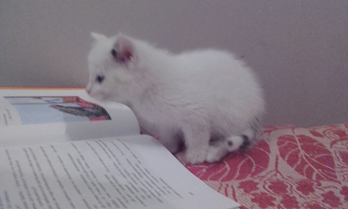 В один прекрасный день под новый год, наш папа принес детям подарок! Восхищению не было предела! Он приехал с работы занес свою сумку, велел не трогать и вышел. Но сумка зашевелилась и нас было не удержать. Приоткрыв замок мы увидели маленький розовый носик и белую мордашку. Видили бы вы детей! КОТЁНОК! Он дрозжал, молча сжался в комочек и смотрел по сторонам. Зайдя домой, муж рассказал, что еле его поймал, что котёнок дикий и даже прокусил палец. Но сейчас малыш сидел поджав ушки и не пытался бежать. Дочка назвала его Снежок, но со временем, он сменил ещё много имен. Как выяснилось, у него и впрямь скверный характер. Он не "разговорчив", а скорее "ворчлив". То не так прошли мимо, то сели рядом, то вообще его место заняли.