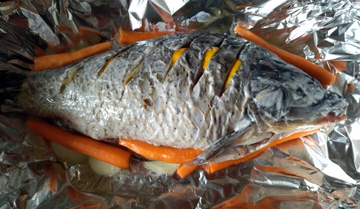 Сегодня решила приготовить карпа. Рыбу очистила от чешуи, выпотрошила, удалила жабры. Посолила,поперчила.смазала сметаной 10%, в брюшко положила грибы,петрушку, вишню, а в надрезы - лимончик. На фольгу уложила лучок и морковь, а на них положила рыбу. Фольгу завернула, и отправила в духовку при 180 градусах на 45 минут. Потом фольгу раскрыла, и подержала ещё минут 20 до "лёгкого румянца". Очень вкусно. Грибы с вишней вообще классные получились! Больше общения и рецептов - в группе "Рецепты для диабетиков" в Facebook! Рецепт на странице в Facebook Автор рецепта - Валентина Смирнова