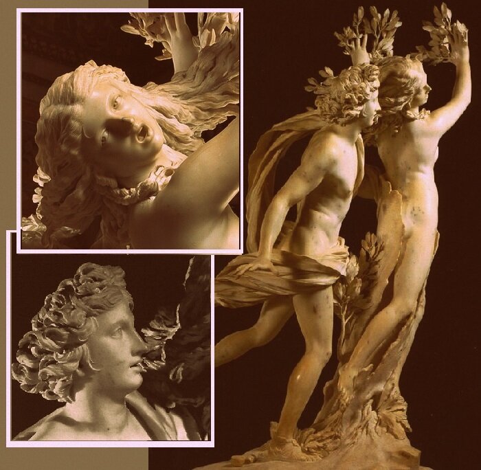 Скульптор Джованни Лоренцо Бернини В своей работе Бернини изобразил своих персонажей в тот момент, когда Аполлон настигает Дафну, которая буквально на наших глазах превращается в дерево. Она уже не девушка, но и еще не лавр. Кора лишь начала обтягивать ее юное тело, а пальцы и локоны только начинают обрастать листвой. Лицо нимфы застыло в ужасе, и мы будто слышим ее крик о помощи. Аполлон же кажется безмерно удивлённым — он только что поймал девушку, а через мгновение держит в руках ветвь дерева. Общая высота скульптуры 2,43 метра, а её вес около 700 кг. Создана она была по заказу Шипионе Боргезе из каррарского мрамора. Эта работа получилась настолько ювелирной, что сам Бернини в глубокой старости говорил: сделать лучше у него уже не получилось никогда. «Святой Иероним» (1605-1606 гг).
