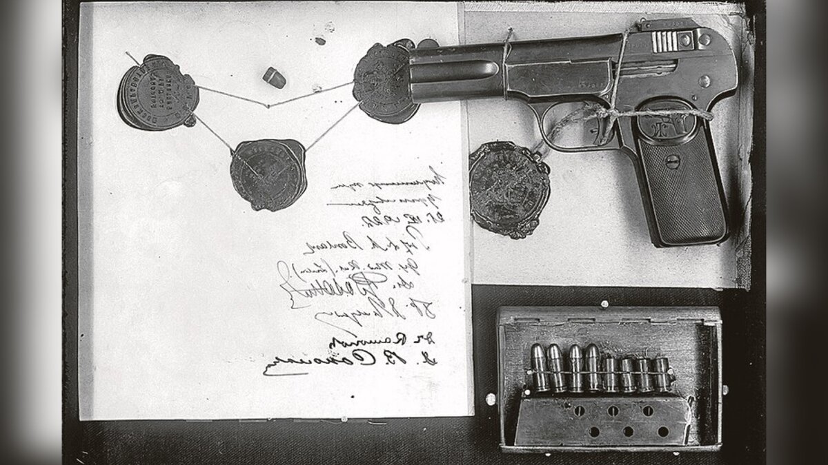 28 июня 1914 года, орудие убийства FN Model 1910, самозарядный пистолет конструкции Джона Браунинга, пришедший на смену Browning M1900 (о нем подробнее в пункте про покушение на Ленина). Патрон 9х17 мм обозначение в США — 380 ACP, емкость магазина 6 патронов.
