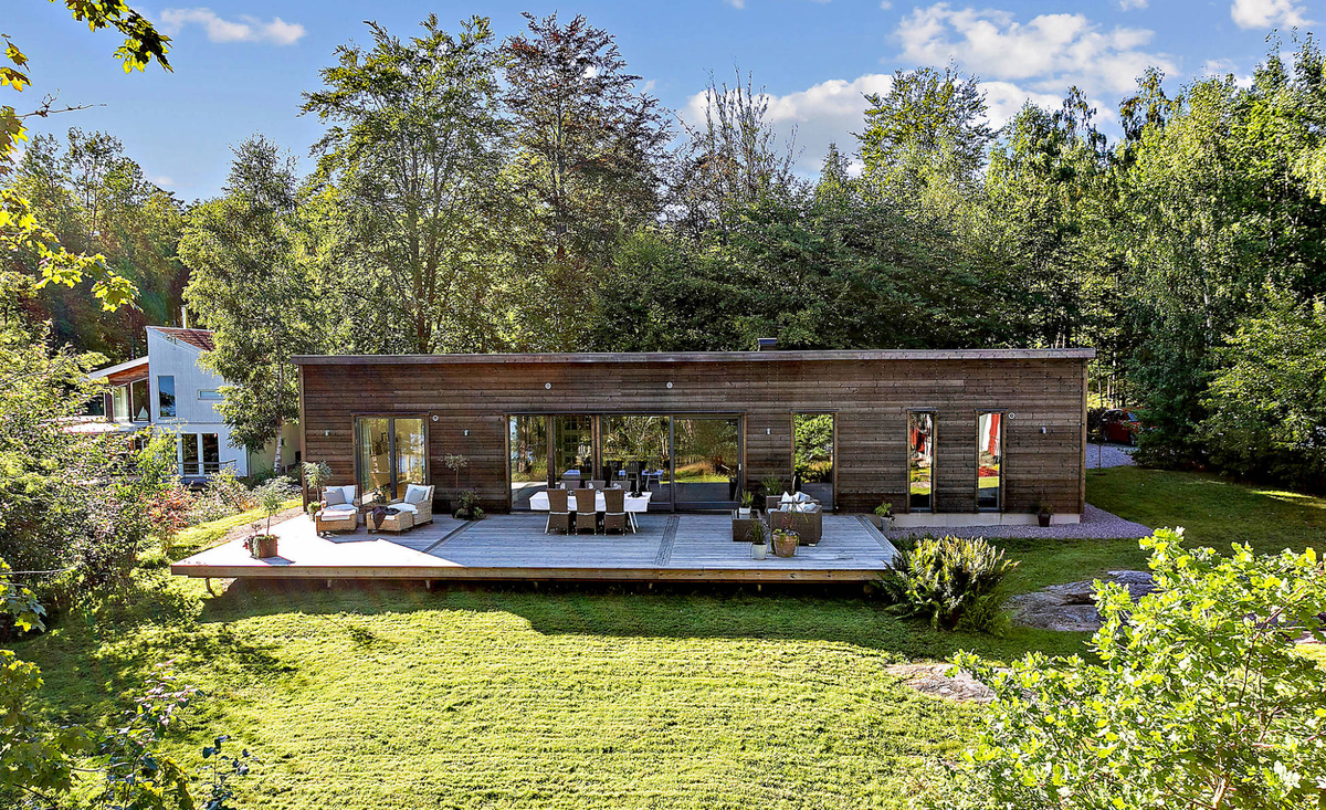 Одноэтажный дом для летнего отдыха: односкатная кровля, большая открытая терраса, три спальни