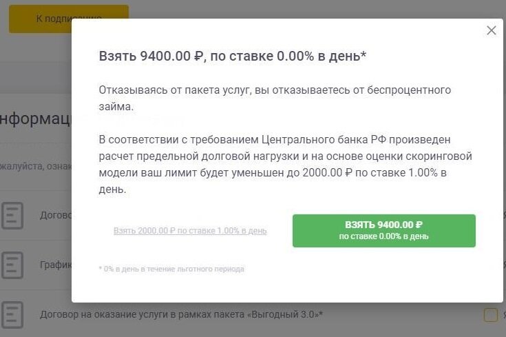 "В соответствии с требованием Центрального Банка РФ произведен расчет предельной долговой нагрузки" - как красиво написано. Если у клиента действительно большая долговая нагрузка, без пакета услуг он получит только 2000 рублей. Но если оплатит пакет "Приоритет", "Выгодный" и так далее в размере от 1400 рублей сумма займа возрастёт до 9400 рублей. Л - логика. У клиента и так много долгов, так если "выкачивать" деньги, то с максимальным размахом.