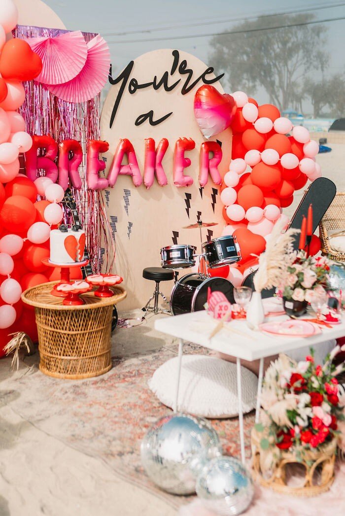 Что мы можем сказать — это точно самая необычная идея для оформления 14 февраля! Декораторы поразмыслили над словом "сердцеед" и решили, что такой термин как нельзя кстати подходит для рок-звезд. Так что всех малышей на этом празднике нарядили, как самую модную рок-группу! О 14 февраля на пляже мы можем только мечтать, но представьте этот декор дома на фоне белых стен — кажется, будет смотреться здорово! Кстати, тут же еще и стиль бохо присутствует, заметили? Множество перьев, колосков, подушечек и плетеной мебели. Бохо плотно вошел в арсенал декораторов в последние годы. Но нарушает это пастельное безобразие огромное количество ярких акцентов! Это дерзкий красный и чернильно-черный: подушки, музыкальные инструменты, шарики и черные молнии в фотозоне. Посмотрите на этих очаровашек! Так и хочется нарядить своих деток так же :) Угощения были самыми простыми, но очень яркими: разноцветные макаронс, тарелочки с закусками, подобранными по цвету, печенье-сердечки и огромный торт! Торт засл