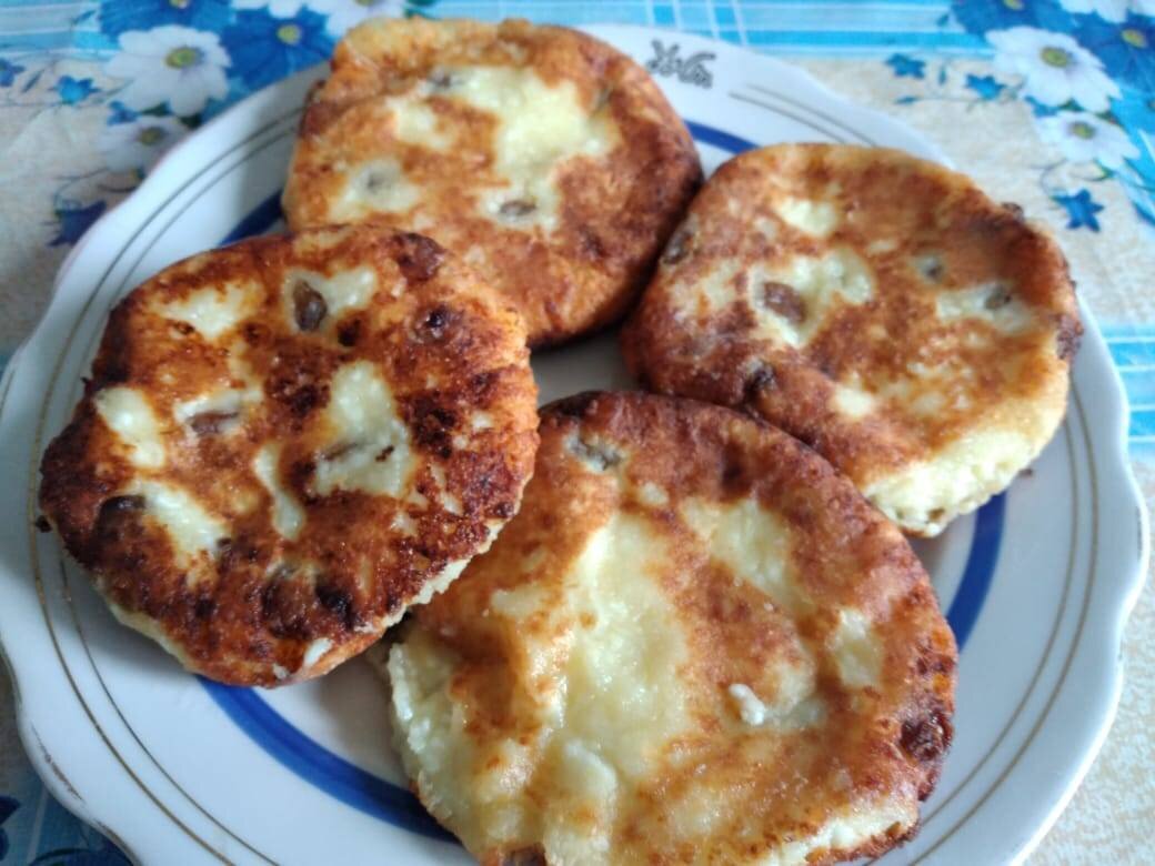 Ингредиенты: творога, куриное яйцо, пшеничной муки, соды, изюма, соли, сахара, ванильного сахара, Подсолнечное масло для жарки Способ приготовления: Размять творог, соединить его с солью, сахаром, ванильным сахаром, подготовленным изюмом, яйцом и перемешать. Добавть муку с содой и снова тщательно перемешать. Сформовать сырники Пожарить с двух сторон на среднем огне.
