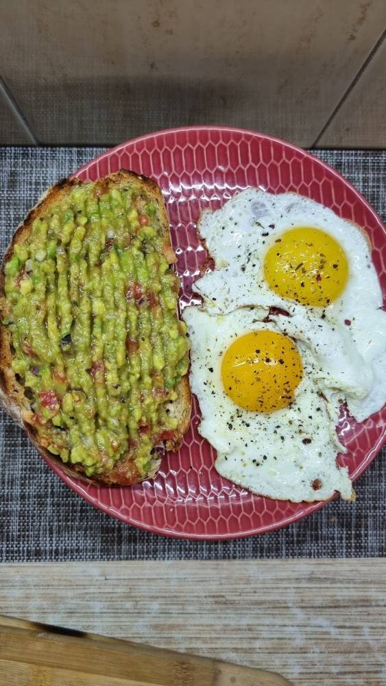 #изавокадо #намазканахлеб #завтрак Ингредиенты: Авокадо спелый, Помидор (у меня розовый), Фиолетовый лук, Сок лимона свежевыжатый, Соль, свежемолотый перец Способ приготовления: Авокадо разрезать пополам и Вытащить косточку, размять вилкой, добавить сок лимона. Помидор и лук нарезать мелко на кубики, добавить к авокадо. Добавить соль, свежемолотый перец и сок лимона по вкусу, перемешать. Обжарить хлеб на сухой сковороде или в тостере и намазать гуакамоле. Приятного аппетита ❤️