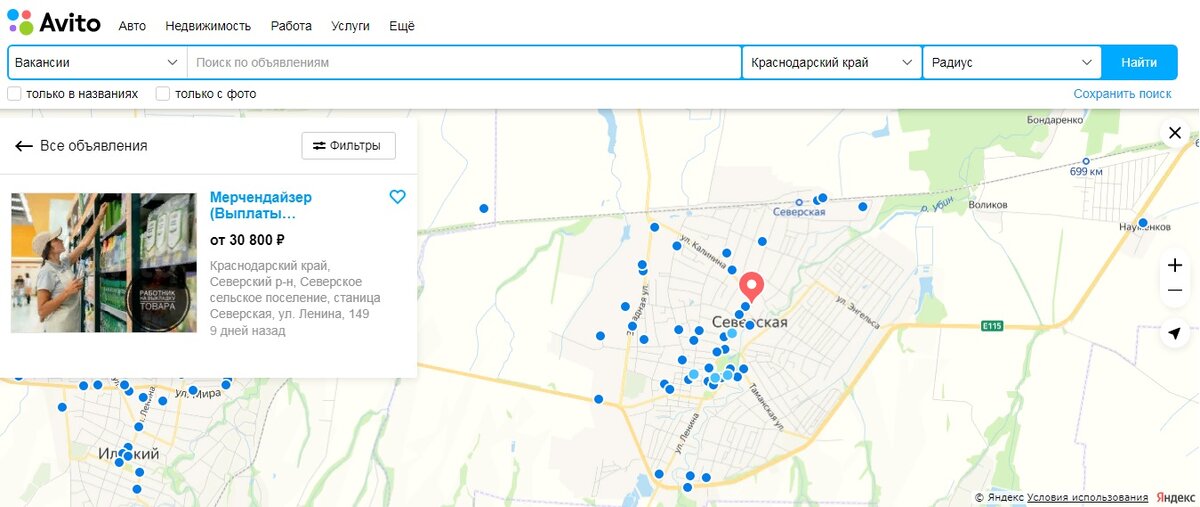 Что предлагает нам Авито: в самом Краснодаре вакансий очень много, но сейчас мы его не рассматриваем. Число вакансий в станицах и поселках возрастает по мере территориального приближения к городу. Но так же мы видим большое количество рабочих мест в Крымске/Новороссийске.