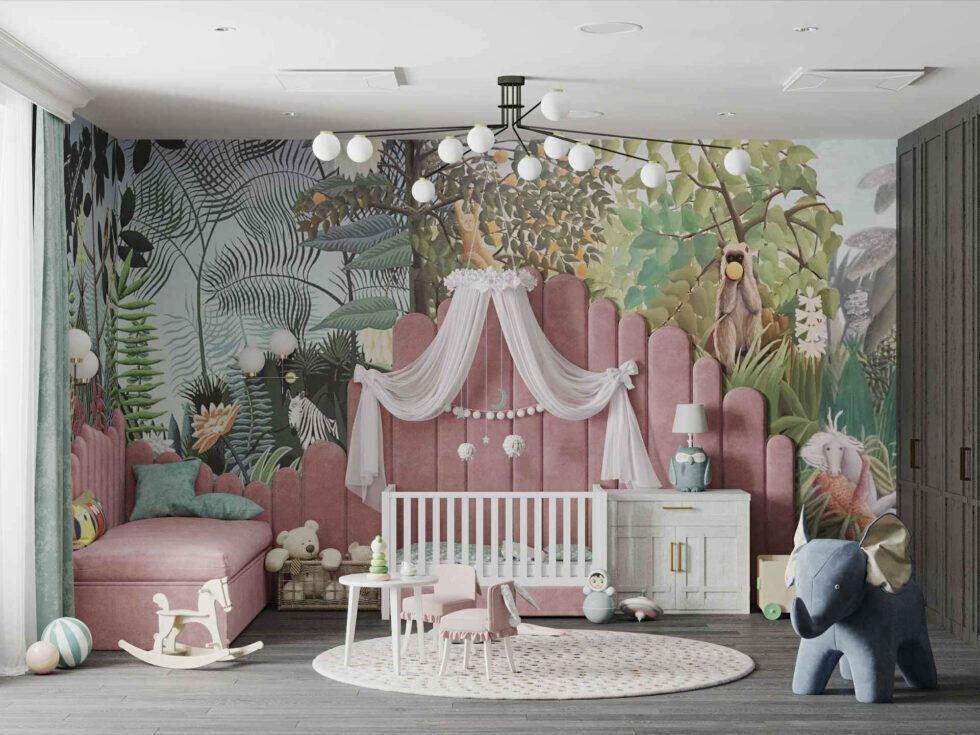 Когда требуется обновить интерьер детской для девочки-малышки, следует обратить внимание к этому дизайн-проекту. Комфортная и стильная мебель сделает комнату красивой и самой любимой у малышки. Подробнее здесь Эта просторная детская станет самым необычным местом в доме, благодаря веселому тропическому декору. Стены комнаты украшают красочные рисунки тропических растений и животных. Девочке очень понравится разглядывать пестрых попугаев, обезьянок, зебр и лемуров. Дизайнерская мебель в зоне отдыха словно обрамлена симпатичными и такими мягенькими стеновыми панелями насыщенного розового оттенка. Они отлично защитят малышку от холода стены и сделают интерьер спальни более уютным. Всю стену напротив кроватки занимаю вместительные навесные полки. Мебель для спальни крепится прямо к стене, поэтому такая конструкция выглядит намного аккуратнее, чем полноценный стеллаж. Благодаря лаконичной и очень компактной мебели дизайнерам удалось сохранить максимум свободного места в спальне. В результате