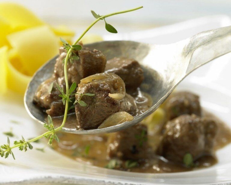 Лимон ошпарить кипятком, немного шкурки потереть на мелко терке. Бульон, пиво, 2 ч.л. тертой шкурки лимона, соль и перец добавить в кастрюлю к мясу. Закрыть крышкой, тушить на среднем огне в течении 2 часов, по необходимости можно добавить еще пива или бульона.