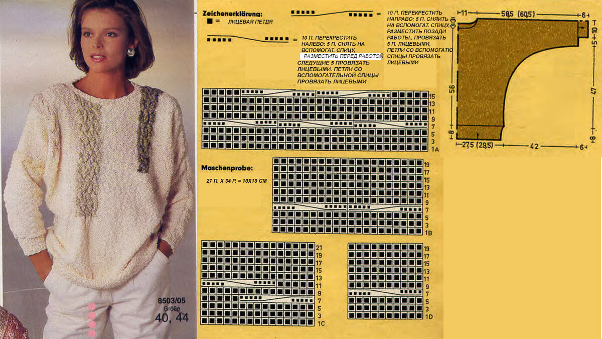 Ажур выполняется по схеме А - раппопорт 6 рядов на 13 петель. Плотность на ажуре спицами №4,5 - 13п х 24р = 8х10см.